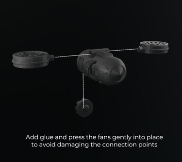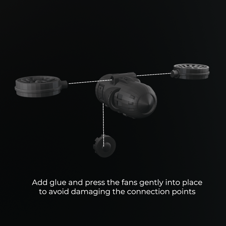 - Add a small amount of glue on the connection points and gently press the Familiar's lift fans into position, they are a snug fit and do not need to be pressed with a lot of pressure. Press too hard and you may break the model.
