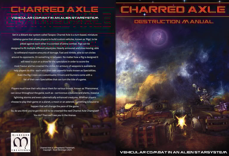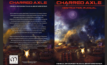 Inside this 58 page manual you will find all the rules needed to play a game of Charred Axle, including a large Rig Design section that gives you countless options for customising your Rig to suit your personal play style. In addition to the rules you will find multiple sections on the lore and history surrounding Charred Axle and the Tarapor star system where it originates.